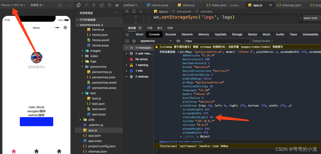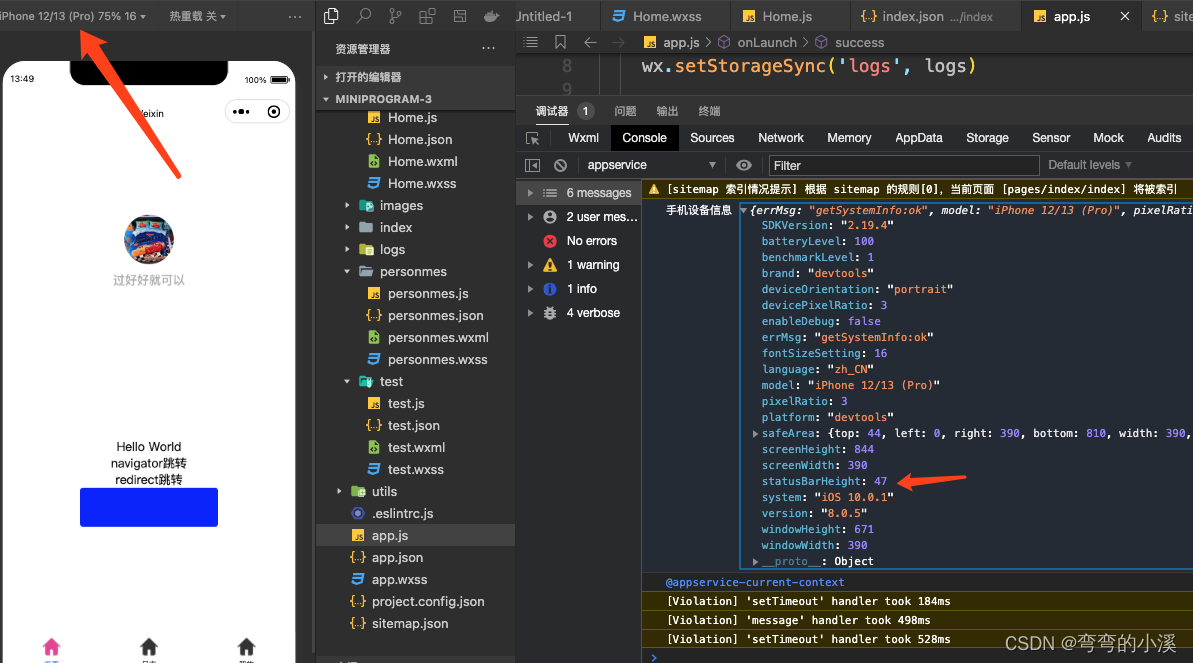 wx.getSystemInfo(Object object) | 微信开放文档 wx.getSystemInfo({ success (res) { console.log(res.model) console.log(res.pixelRatio) console.log(res.windowWidth) console.log(res.windowHeight) console.log(res.language) console.log(res.version) console.log(res.platform) } })苹果手机不通机型在同一个系统下状态栏的高度可能不通,从ios14开始,刘海屏手机的状态栏不一定是44,ios14系统增加了 一个隐私提示灯 功能,因此ios14之前状态栏高度:有刘海屏iPhone为44,无刘海屏为20。 但是从ios14开始有刘海屏的iPhone状态栏高度不一定是44了。如: iPhoneXR,iPhone11 状态栏高度为48, iPhone X,iPhone 11 Pro,iPhone 11 Pro Max,iPhone 12 mini,状态栏高度44, iPhone 12,iPhone 12 Pro,iPhone 12 Pro Max,状态栏高度为47. iPhone 13 mini状态栏高度为50, iPhone 13,iPhone 13 Pro,iPhone 13 Pro Max,状态栏高度为47.