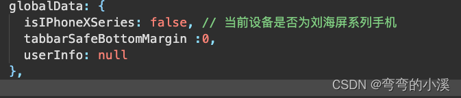 所有设备型号官网地址: Models - The iPhone Wiki 由于刘海屏的状态栏的高度不固定,但是都是大于20的,非刘海屏的状态栏都是20, 所以判断是iPhone刘海屏机型的条件就可以是: model带iPhone字样 && statusBarHeight > 20, 我们写一个全局变量在app.js文件中: